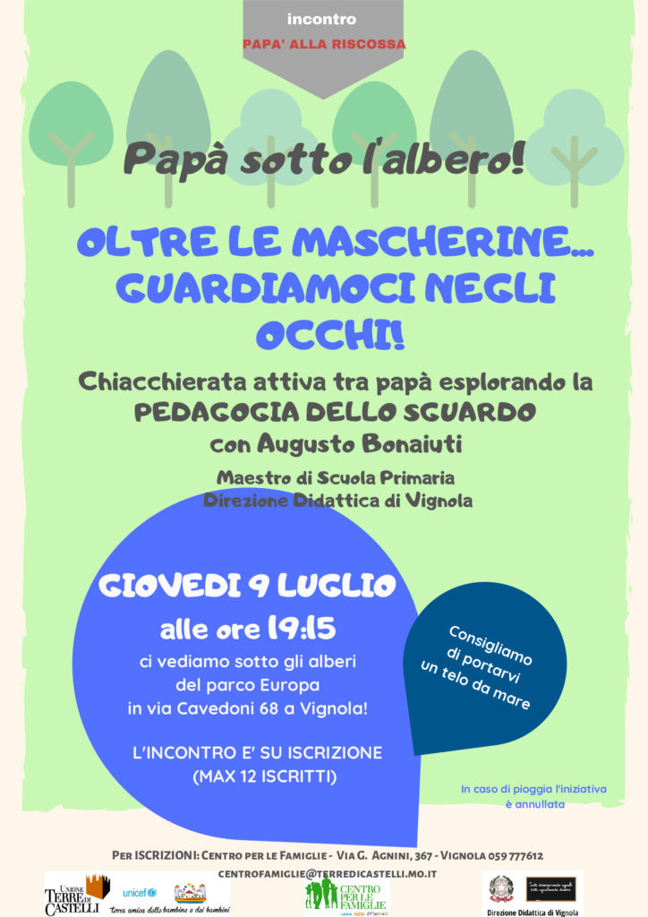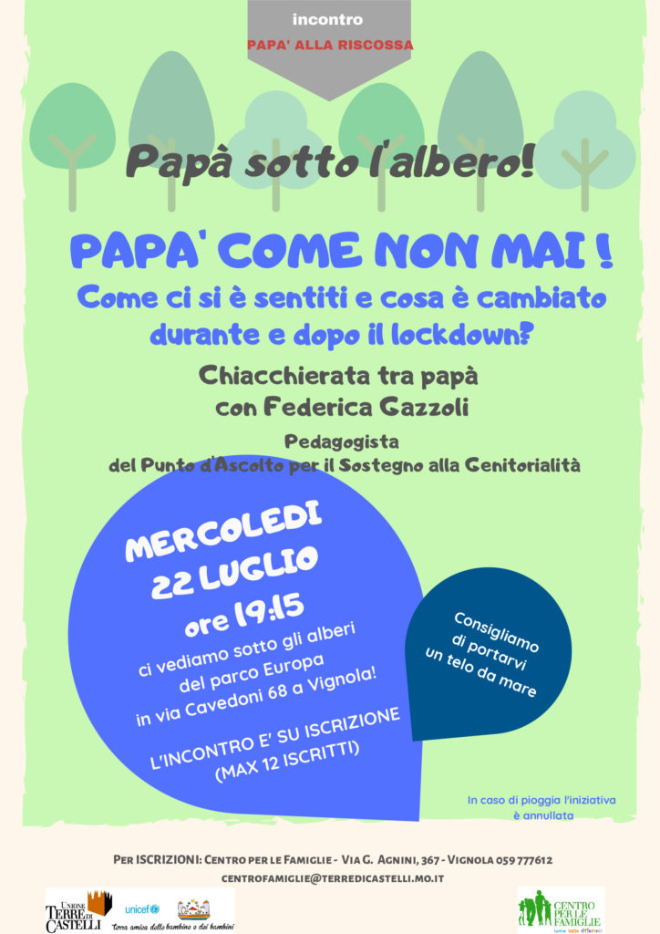 Si pubblicano le locandine degli incontri organizzati nel mese di luglio dal Centro per le Famiglie dell’Unione Terre di Castelli.